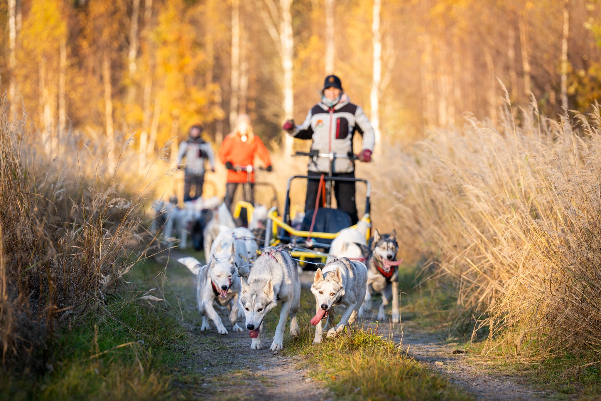 Koko perheelle sopiva ohjelma alkaa 7-10km kärryajelulla, jossa pääset ajo-opetuksen jälkeen itse ohjaamaan valjakkoa. Kyydissä istuvat voivat nauttia ajelusta maisemia ihaillen tai kuvia ottaen. Puolessa välissä voitte vaihtaa paikkoja kuljettajan ja kyydissä olevan aikuisen kesken. Ajelun jälkeen pääset tutustumaan huskien omaan juoksutarhaan, jossa ympärilläsi juoksee irti n.40 huskia! Voit seurata kuinka ne kommunikoivat keskenään ja saat rapsutella koiria mielin määrin.